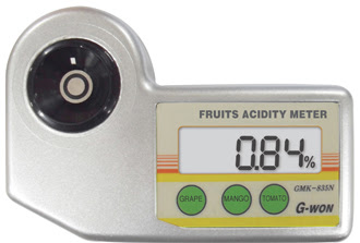 Máy đo độ acid trái cây GMK-835N dùng cho 3 chỉ tiêu trong các loại trái cây như Cam quýt, nho, táo, cam, dứa, lê, Dâu, Kiwi, Mận, Đào, Xoài, Cà chua, Chery, Quả việt quất, dâu tằm, lựu, chanh…