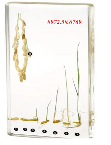 Sản phẩm được thiết kế trong khối nhựa trong suốt, chứa các mẫu vật thật được sắp xếp theo trình tự phát triển tự nhiên, giúp người học quan sát rõ ràng từng bước trong quá trình nảy mầm và sinh trưởng của cây lúa.