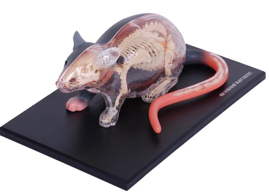 Mô hình được thiết kế mô phỏng chuột với kích thước thật, giúp người học quan sát rõ ràng các đặc điểm hình thái ngoài và cấu trúc bên trong của cơ thể chuột.