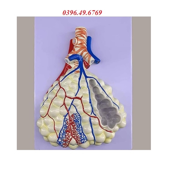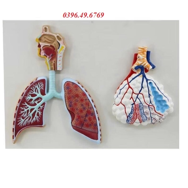 - Mô hình phổi và phế nang thể hiện đầy đủ đường hô hấp từ khoang mũi, khoang miệng đến khí quản, phế quản và cây phế quản phải đi sâu vào các thùy phổi.