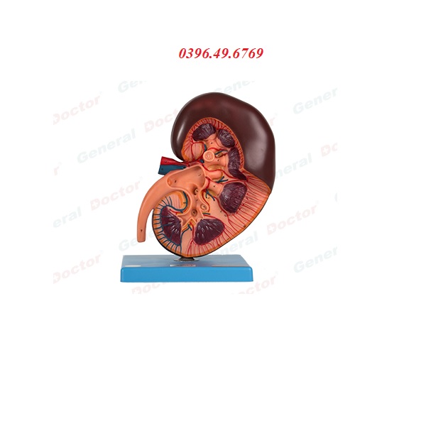 Mô hình thận thể hiện cấu trúc giải phẫu của thận, bao gồm: vỏ thận, tủy thận, đài thận nhỏ, đài thận lớn, bể thận, niệu quản, động mạch thận, tĩnh mạch thận, v.v.