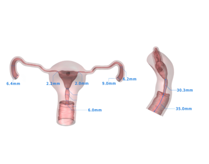 Mô hình được chế tạo từ silicone y tế mềm cao cấp (độ cứng 18A~30A), mô phỏng chính xác cấu trúc âm đạo, tử cung và phần phụ (ống dẫn trứng, buồng trứng) của cơ thể nữ giới.
